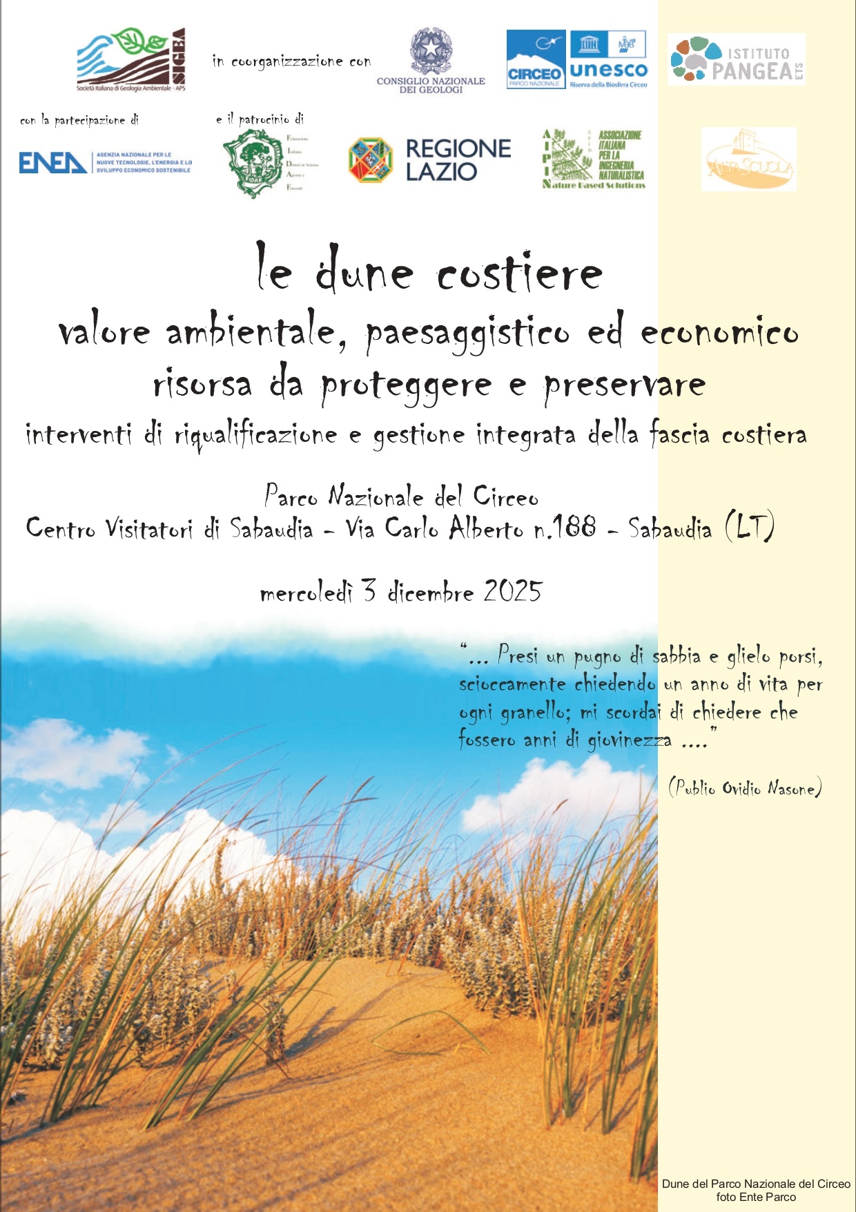 “le dune costiere – Valore ambientale, paesaggistico ed economico. Risorsa da proteggere e preservare – interventi di riqualificazione e gestione integrata della fascia costiera” – Parco Nazionale del Circeo Centro Visitatori di Sabaudia – Via Carlo Alberto n. 188 – Sabaudia (LT), 3 dicembre 2025.